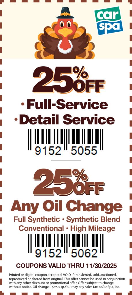We have a variety of offers to share with our valued customers. Don’t forget, if you join our Unlimited Car Wash Club, you not only get unlimited washes each month but also 20% Off any detail service or oil change services at any Car Spa location.
