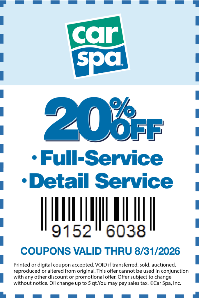 We have a variety of offers to share with our valued customers. Don’t forget, if you join our Unlimited Car Wash Club, you not only get unlimited washes each month but also 20% Off any detail service or oil change services at any Car Spa location.
